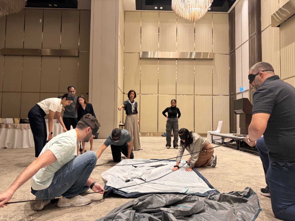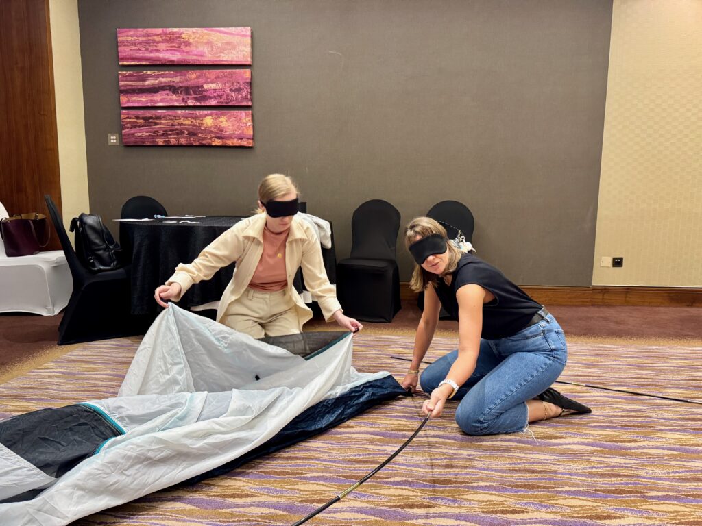 The activity starts with quick icebreakers and team formation. Half of the participants are blindfolded while their teammates give step-by-step instructions to build the tent. Midway through, roles are switched, helping everyone experience leading and following under pressure.